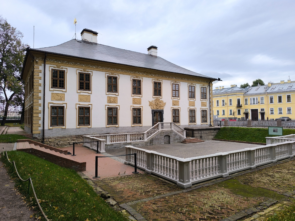 Продолжаем гулять по Летнему саду, друзья! Это место неистощимо на эмоции. Перед вами Летний дворец Петра I, построенный, как и многие здания в Санкт-Петербурге, архитектором Доменико Трезини. Дворец пережил всё -- наводнение 1777 года, после которого волей Екатерины II были засыпаны все фонтаны Летнего сада, пережил революцию и разрушения Гражданской войны, пережил Великую Отечественную войну. В него не попал ни один снаряд. Всю войну на этой самой площадке располагалась зенитная батарея. В Летний дворец Петра I можно записаться на экскурсию. Это было бы очень интересно, потому что там сохранились подлинные интерьеры. Все эти сотрясы нескольких веков позволили сохраниться только одному дереву Петровских времён. А вот и вход в одно таинственное место. Но немного терпения, друзья! Сначала заглянем в Кофейный домик, расположенный как раз напротив. А пока обратите внимание на чудесное оформление сада: приятный зелёный цвет архитектурных форм, деревья в кадках, удобная скамейка. Здание