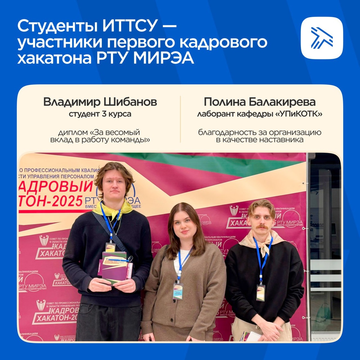 Студенты профиля «Управление персоналом организации» ИТТСУ 💙 стали участниками первого кадрового хакатона, который прошёл на базе Российского технологического университета МИРЭА. В соревновании участвовали команды из ведущих вузов страны. Участники решали профессиональные задачи по подбору персонала, организационному проектированию, нормированию труда, проведению собеседований и разработке адаптационных программ для сотрудников. Работа команд оценивалась экспертной комиссией, в состав которой вошли представители Совета по профессиональным квалификациям в области управления персоналом, заведующие профильными кафедрами вузов и практикующие HR-руководители. По итогам хакатона команда заняла 2 место🥈, а студент Владимир Шибанов ✔️ получил диплом «За весомый вклад в работу команды». Студенты разработали полный цикл HR-процесса: определили потребность в персонале, сформировали заявку, провели поиск кандидатов в системе E-staff, подготовили и провели собеседование, оформили документы для