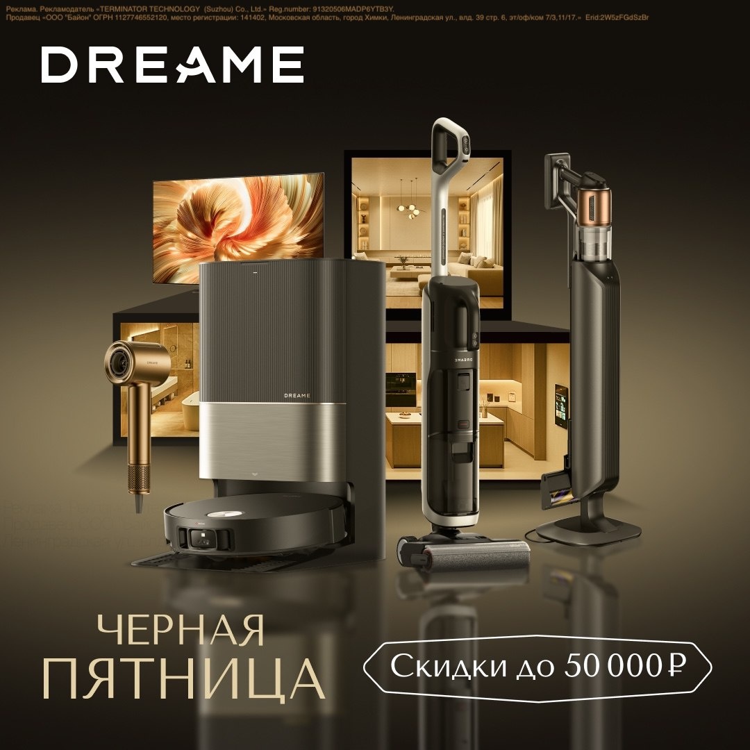 ТОПовые скидки на технику DREAME в честь Чёрной Пятницы! Давно мечтали купить инновационную технику бренда? У вас появилась возможность сделать это с выгодой до 50 000 рублей. На официальном сайте DREAME вас ждёт огромный ассортимент моделей со скидками: от роботов-пылесосов до фенов и телевизоров. Отличный шанс порадовать себя новинками по удачной цене или выбрать подарки для близких. Вот лишь несколько уникальных предложений: - Робот-пылесос Dreame X50 Ultra Complete - 139 990₽ 119 990₽ со скидкой - Беспроводной пылесос Dreame Z20 AquaCycle Station - 74 990₽ 57 990₽ со скидкой - Моющий пылесос Dreame H14 Dual - 64 990₽ 59 990₽ со скидкой - Телевизор Dreame S100 - Скидка: до -20 000₽ (зависит от диагонали) - Фен Dreame Pilot 44 990₽ 39 990₽ со скидкой Торопитесь, акция продлится с 18 ноября по 1 декабря 2025 года!
