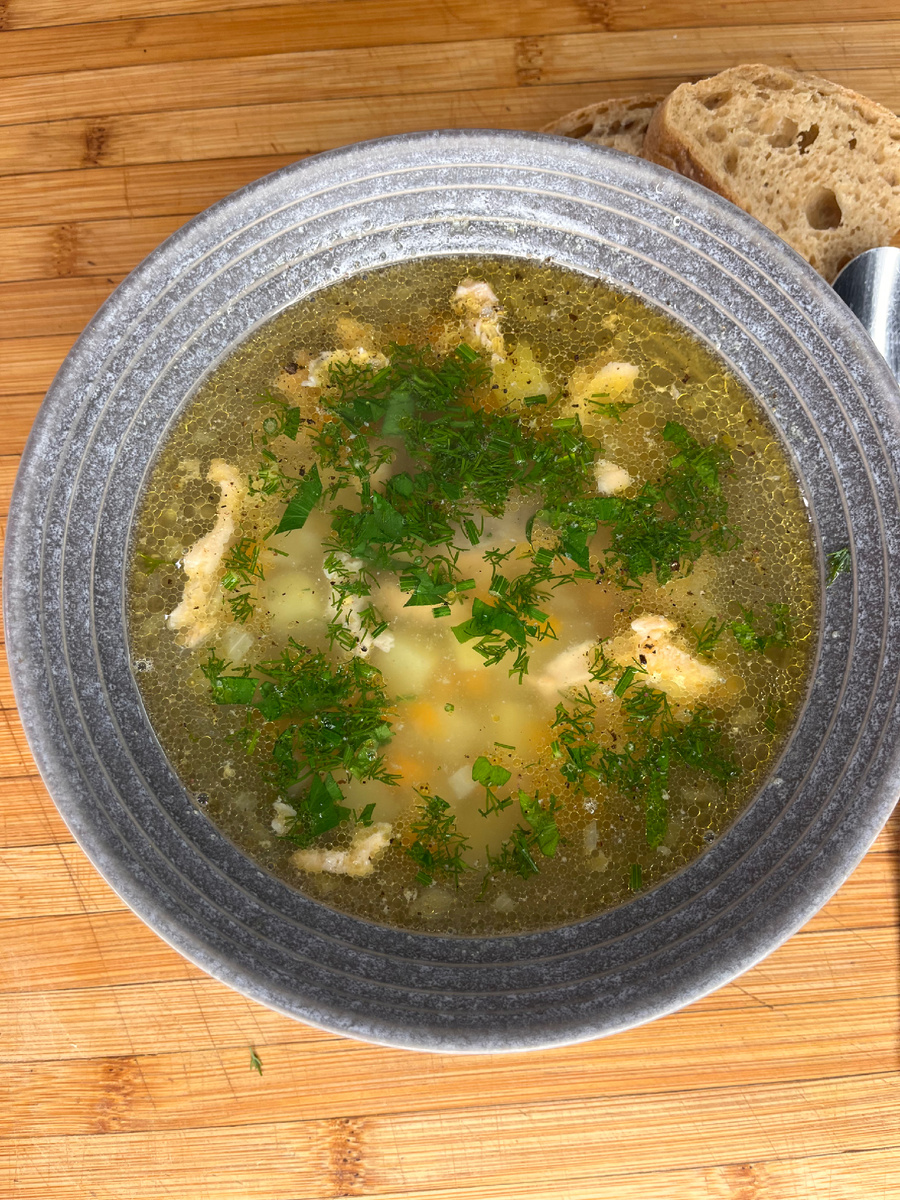 - Бульон процеди, чтобы убрать косточки.