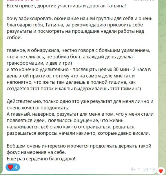 Не понимай, а просто делай! Когда мы начинаем что-то новое, нам часто кажется, что сначала нужно во всём разобраться. Но самый верный путь - это начать действовать, даже если механизм не до конца понятен. Регулярность творит чудеса, и результат приходит через практику, а не только через понимание. Вот что говорит участница фокус-группы, которая просто доверилась процессу и начала регулярно делать трансформации: Главное, я обнаружила, честно говоря с большим удивлением, что я не слилась, не забила болт, а каждый день делала трансформации, и две и три) и это конечно удивительно - посвящать целых 30 мин - 2 часа в день этой практике, потому что на самом деле мне так и непонятно, что же ты там делаешь в полной тишине, как создаётся этот поток и как ты выдерживаешь этот тайминг) Как это работает? На каждой трансформации запускается мощный поток энергии, который помогает мягко раскрыться и отпустить застоявшиеся блоки, негативные эмоции и деструктивы. И вот что произошло, когда она вош
