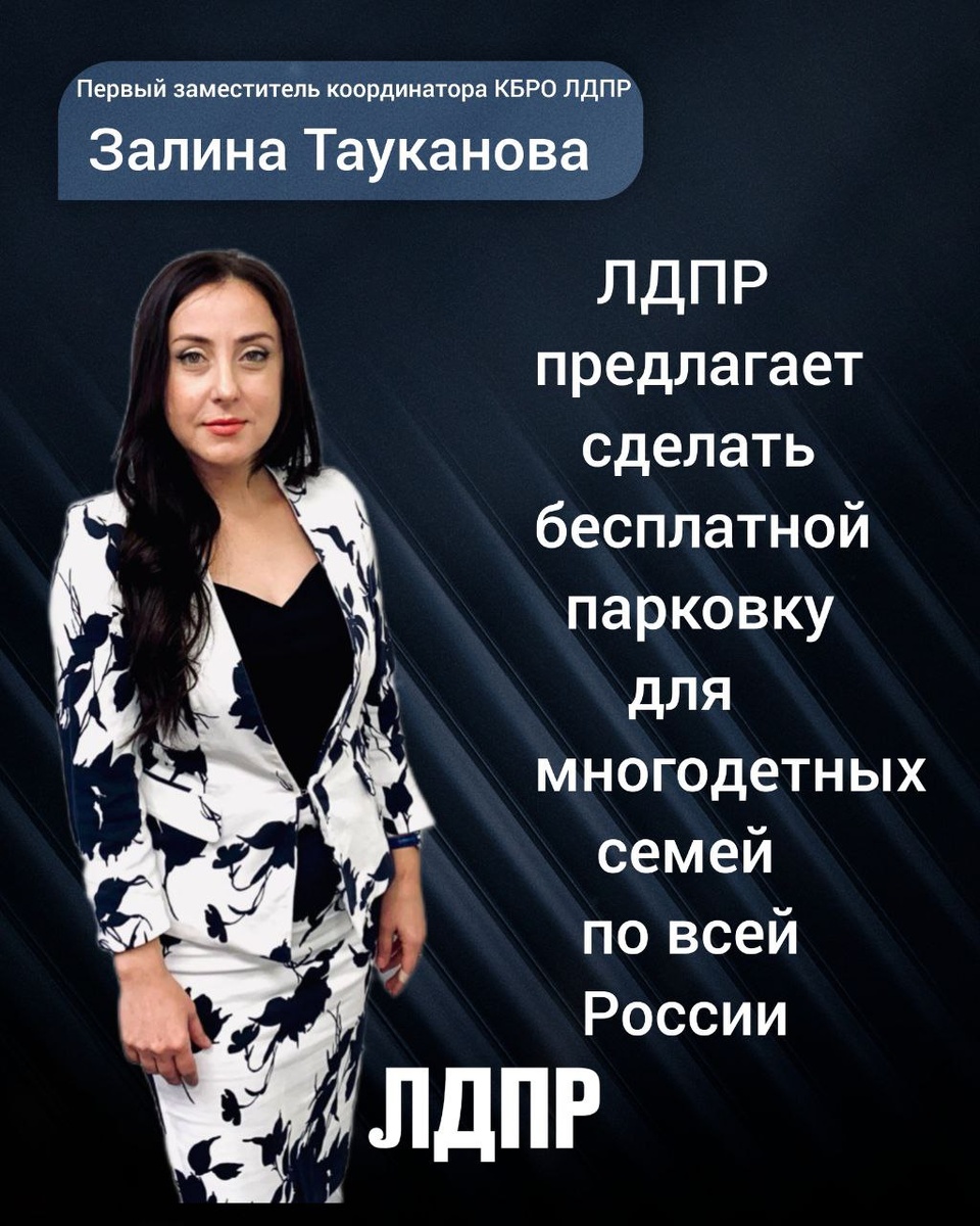 ЛДПР выступила с предложением о введении бесплатной парковки для многодетных семей по всей территории России. Соответствующий законопроект внесен на рассмотрение в Правительство РФ. Инициатива предполагает предоставление права бесплатной парковки одного автомобиля, принадлежащего одному из родителей, на всех платных парковках страны. В настоящее время такой льготой пользуются лишь жители Москвы и Санкт-Петербурга, тогда как в России проживает более 2,5 миллионов многодетных семей, многие из которых не имеют подобных привилегий Первый заместитель координатора Кабардино-Балкарского регионального отделения ЛДПР, Залина Тауканова, выразила поддержку этой инициативе, подчеркнув её своевременность и особую актуальность для Кабардино-Балкарской Республики.
