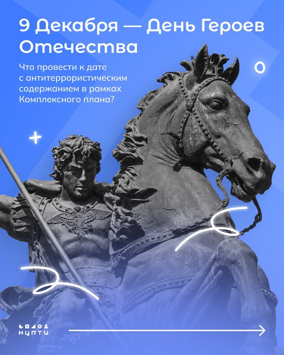 Что провести для студентов ко Дню Героев Отечества? Памятная дата отмечается 9 декабря. Это возможность провести мероприятие с антитеррористическим содержанием. Пункты Комплексного плана, форматы и рекомендации — в карточках! 🌐 НЦПТИ | 📲 Мы в МАХ | #нцпти_профилактика #антитеррор