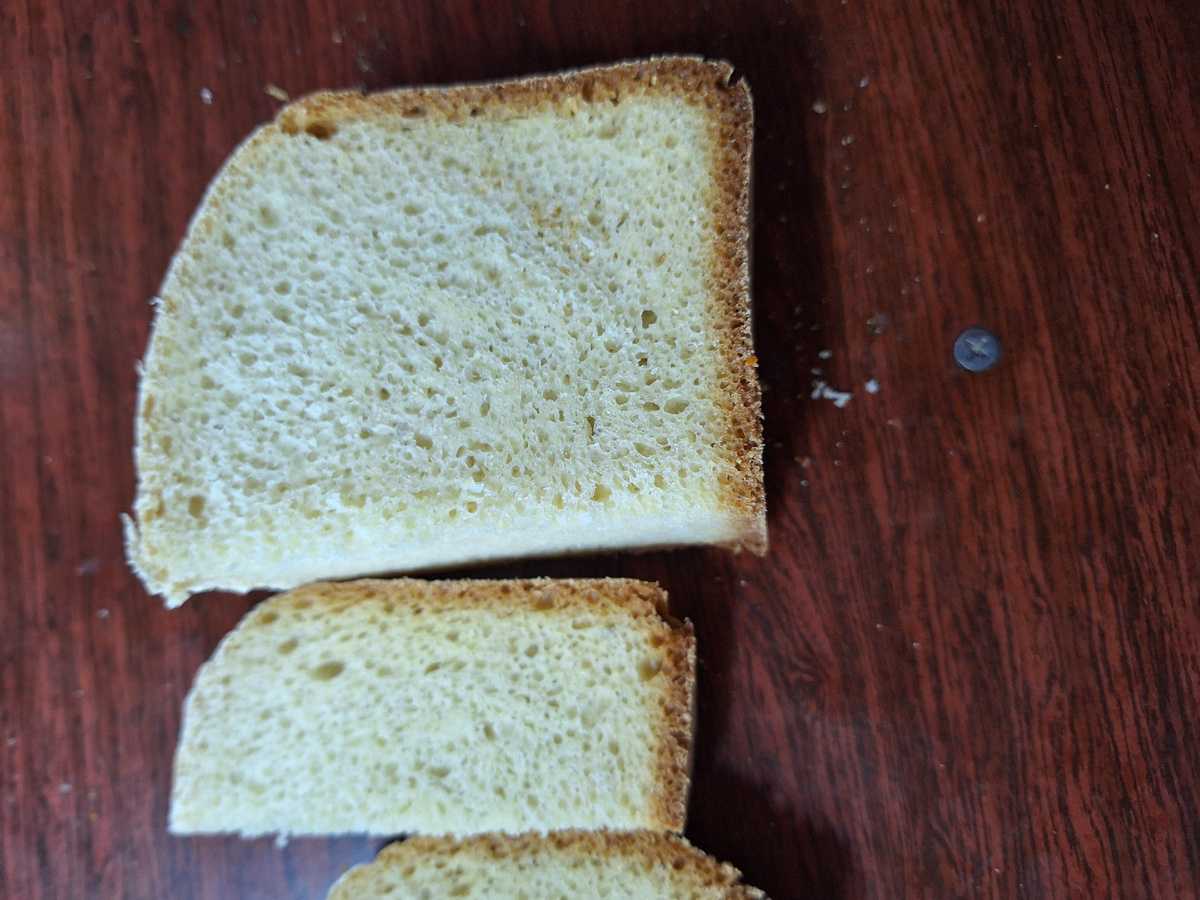 Две недели назад купила хлебопечку, так как посмотрела у блогеров, мне понравилось. И решила, а почему бы не попробовать. И вот с тех пор мы в магазине хлеб не покупаем. И что ещё выгодно и для здоровья лучше, это то, что когда покупаешь хлеб в пекарне, заодним покупаем какую-нибудь булочку. А вот уже две недели никаких булочек, едим только свой хлеб. Опыт в выпекании хлеба приходит постепенно. Испробовала разные рецепты с книжки, которая идёт с печкой. Бывало верхушка почему-то опадала, но вкус у хлеба был вкусный, несмотря на страную форму. Стала класть меньше дрожжей. Почему-то на три часа надо 1 чайную ложку дрожжей, а на 2ч40мин -2 чайной ложки. Вот с двумя хлеб поднимается быстро и до начала жарки успевает опадать. Теперь убавила дрожжи, в любой хлеб кладу 1 чл, и всё стало нормально. Со временем разберусь ,поэкспериментирую и выведу золотую середину, сколько и чего класть. Вот такой кусочек хлеба остался-это у меня хлеб с добавкой кукурузной муки-очень вкусный, нам он пришёлся п