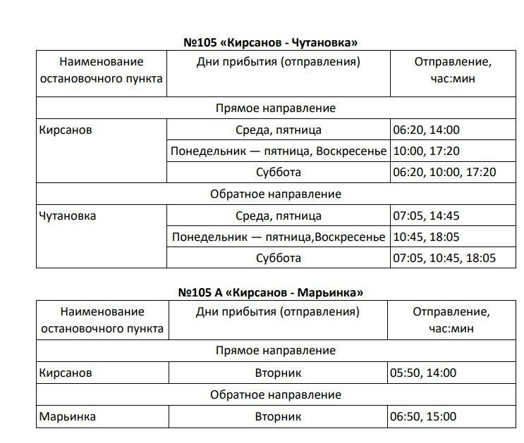 Несмотря на перекрытие моста в Уметском округе, общественный транспорт продолжает функционировать между населенными пунктами Кирсанова, Уметского и Кирсановского муниципальных образований. Пассажирские перевозки по маршрутам «Кирсанов – Чутановка», «Кирсанов – Марьинка» и «Кирсанов – Рамза» будут осуществляться по расписанию двумя автобусами. Каждый маршрут будет состоять из трех этапов: 1. Первый автобус отправится из Кирсанова до моста через реку Ворону. 2. Затем пассажиры смогут пересесть на второй автобус. 3. Второй автобус довезёт пассажиров от моста до конечной точки маршрута. | Администрация Кирсанова |