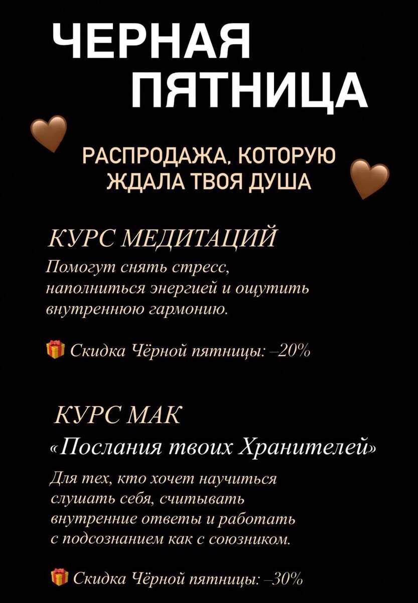 🖤 ЧЁРНАЯ ПЯТНИЦА — РАСПРОДАЖА, КОТОРУЮ ЖДАЛА ТВОЯ ДУША 🖤 Только 5 дней — цены тают быстрее, чем стресс после хорошей медитации. ✨ МЕДИТАЦИИ АРХАНГЕЛОВ от Ирины Лакши Помогут снять стресс, наполниться энергией и ощутить внутреннюю гармонию. 🎁 Скидка Чёрной пятницы: –20% на весь курс. 4000 ₽ вместо 5000, за весь курс (5 медитаций) - 16000 ₽ вместо 20000!!! ⸻ 🔮 КУРС МАК «Послание твоих Хранителей» Ирины Лакши (метафорические карты) Для тех, кто хочет научиться слушать себя, считывать внутренние ответы и работать с подсознанием как с союзником. 🎁 Скидка Чёрной пятницы: –30% на курс МАК. 24500 ₽ вместо 35000!!! 🖤 Только до 22 ноября! Сделай шаг к спокойствию, осознанности и прокачке интуиции. Чёрная пятница — идеальное время, чтобы побаловать себя полезным. 🔥 Успей забрать по лучшей цене — потом будет дороже, а жить хочется легче уже сейчас. 💌 Для подробной информации пишите в директ куратору Катерине (@kateringreen)