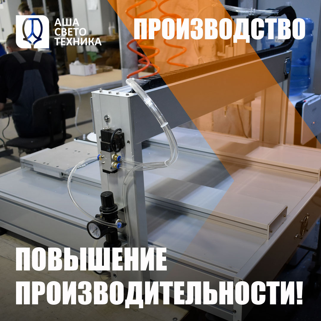 Сокращение времени монтажа светодиодных светильников почти в два раза — результат комплексной модернизации сборочного процесса на АО «Ашасветотехника». Основные факторы повышения производительности: 1. Оптимизация конструкции светильника АС-ДСП-015. Конструкторским отделом разработана усовершенствованная конструкция: внедрено улучшенное соединение светодиодных плат, модифицирован алюминиевый радиатор, разработана новая конфигурация прокладки контура герметизации, обеспечена унификация кронштейнов. Данные конструктивные улучшения позволили сократить количество операций при сборке, упростить логистику комплектующих и минимизировать вариативность комплектаций. 2. Внедрение интеллектуального станка для нанесения герметика. Новая система нанесения герметика оснащена платформой и дозирующей головой с программным управлением перемещения по плоскостям. Машина обеспечивает высокую точность дозировки, стабильное позиционирование и повторяемость параметров нанесения. Это улучшение позволяет равн
