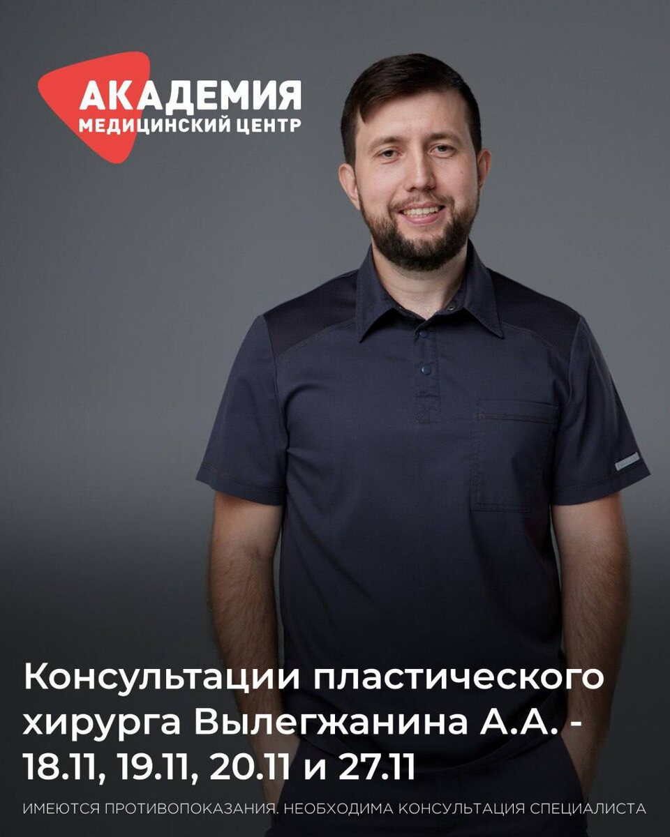 В МЦ «Академия» — пластический хирург из Санкт-Петербурга! 📅 18, 19, 20 и 27 ноября у вас есть возможность попасть на приём к Андрею Александровичу Вылегжанину - пластическому, челюстно-лицевому хирургу, врачу высшей категории с большим опытом и филигранным подходом. 💬 Его специализация — эстетика лица: ⭕️ Ринопластика и риносептопластика ⭕️ Омолаживающие операции на лице и шее ⭕️ Маммопластика ⭕️ Отопластика ⭕️ Липосакция 📍 Приём проходит в филиале МЦ «Академия» на ул. Красноармейская, 2 ____ — телефон 📞 +7 8422 27-05-05 или +7 927 809-23-46 — сайт 🌐 academy-med.ru — телеграм @Academychat73 📌 Количество мест ограничено.