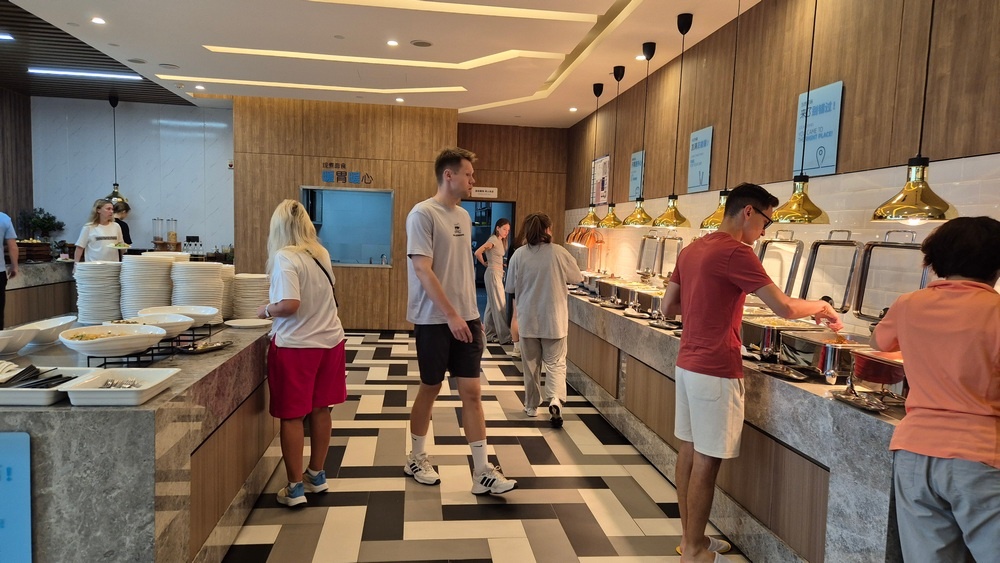 Кормят Сычуаньские авиалинии в полете не ахово Поэтому завтрак в транзитном отеле - немаловажная часть поездки. Выбор там конечно скромный, мягко говоря. Но все же получше на мой взгляд, чем в транзитном отеле авиакомпании China Southern Airlines в Шэньчжэне. Точнее не лучше, а просто чуть больше выбор еды, привычной для европейца и есть нормальные столовые приборы Судите сами. Несмотря на то, что гостиница именно для транзитных пассажиров, т.е. любых национальностей, основной выбор блюд - это чисто китайская кухня Но довольно много блюд из овощей или с овощами А вот со свежими овощами и фруктами не особо... Но найти что-то привычное для европейского желудка можно - яйца вареные и даже жареные правда остывшие и отвратительно приготовленные Или "кошачий корм" Лично я паровые китайские рисовые булочки терпеть не могу, но отмечу, что выбор их довольно большой. И с не сладкими начинками И сладкие Но есть и более подходящие для европейского вкуса десерты Из напитков обычный на