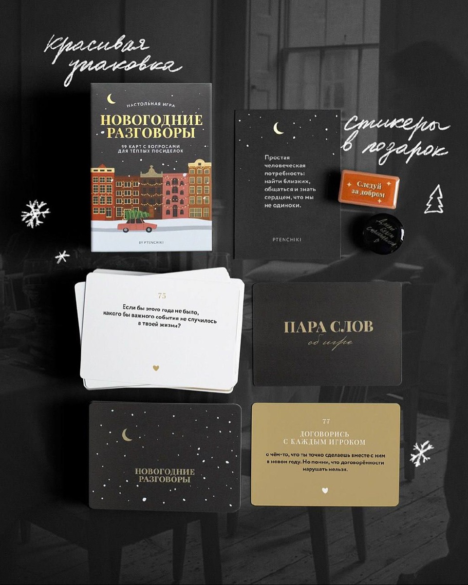 🧦 ☕️ Идея для зимних посиделок: вспомнить уходящий год и построить честные планы на новый «Новогодние разговоры» от бренда Ptenchiki — карточная игра для компании, которая собралась поболтать по душам. Набор состоит из 99 карточек с искренними вопросами и милыми заданиями, которые помогут вспомнить важные моменты уходящего года и зарядиться хорошим настроением на следующий. В комплекте — открытка и объемные стикеры. Сам набор приходит в красивой картонной упаковке — готовый подарок! Заказать можно здесь.