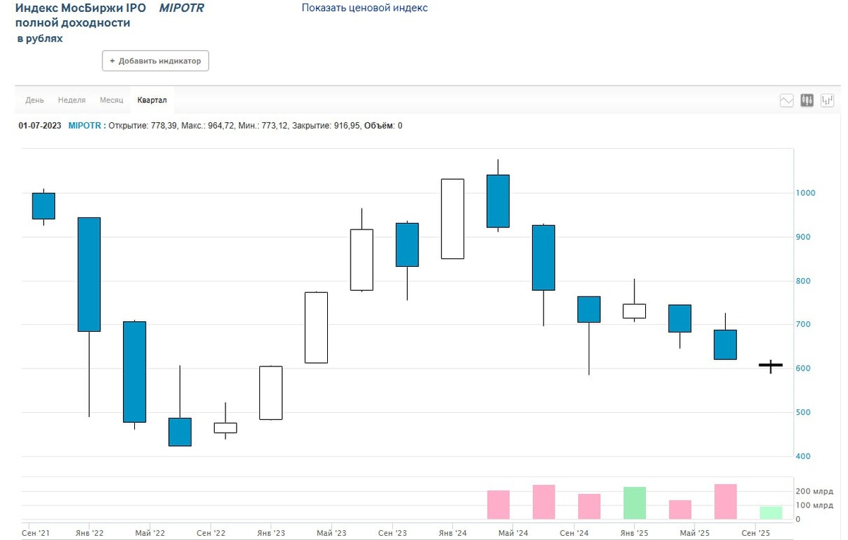 ⚡️Сказка про IPO Однажды встретились на узкой дорожке где-то в комментариях два богатыря - Фанат и Критик. И стали они спорить, выгодно ли покупать акции на IPO. Бьются не на жизнь, а на смерть. Фанат лупит наотмашь Совкомбанком, который вырос в первые месяцы после размещения на 60%. Критик достает из широких штанин МТС Банк, скукожившийся в цене вдвое. Фанат наносит укол Озон Фармацевтикой, подорожавшей в полтора раза. Критик стучит оппонента по голове ВсемиИнструментами.ру, упавшими с 200 до 66 рублей. Так и состарились бы богатыри в битве, если б на их счастье не пролетал мимо на ковре-вертолете Хоттабыч. Рассказал он им, что спорить на основе неполных данных без желания найти истину – затея увлекательная, но пустая. Подарил им Статистику, знать которую полезно не только богатырям. Оказывается, 11 ноября 2021 г. Московская биржа начала расчет индекса IPO, в который входят акции, эмитенты которых осуществили первичное размещение на бирже. Стартовал индекс с 1000 пунктов. Помимо ц