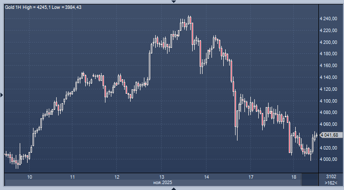 Джефферсон считает, что ФРС необходимо действовать медленно с дальнейшим снижением ставок. Акцент смещается на данные о занятости в несельскохозяйственном секторе США Данные будут опубликованы в четверг. Трейдеры оценивают вероятность снижения процентной ставки в США в декабре в 46%. График спот-цены золота интервалами в 60 минут Во вторник цены на золото снизились до самого низкого уровня за более чем неделю, поскольку прогнозы о дальнейшем снижении процентных ставок Федеральной резервной системы оказались менее оптимистичными, чем ожидалось. Это привело к снижению спроса на золото в преддверии публикации экономических данных из США, которые были задержаны из-за приостановки работы правительства. На спотовом рынке золото потеряло в цене 0,3%, опустившись до $4033,29 за унцию к 09:09 по Гринвичу. Это стало минимумом с 10 ноября прошлого года. Фьючерсы на золото с поставкой в декабре также снизились на 1%, достигнув отметки $4032,60 за унцию. Аналитик UBS Джованни Стауново отметил, что