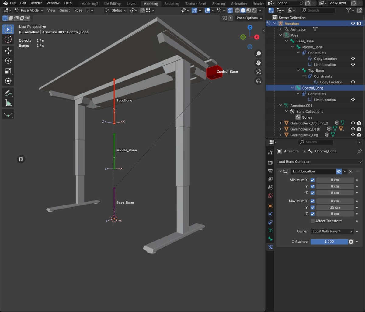 Памятка: как настроить кости для телескопической механики в Blender 📚 Решил зафиксировать настройку рига для регулируемого стола, пока свежо в памяти. В следующий раз, когда понадобится сделать похожую механику (телескопические стойки, выдвижные элементы и т.д.) — не придётся заново гуглить и вспоминать 😅 Может и вам пригодится! 🏗 Иерархия костей: Armature.001 └── Base_Bone [ROOT - основание] ├── Middle_Bone [Child of Base_Bone] │ └── Top_Bone [Child of Middle_Bone] │ └── Control_Bone [Child of Base_Bone] 📋 ЧАСТЬ 1: Настройка костей 1. Base_Bone (основание) - Parent: нет (root) - Constraints: нет - Роль: якорь всей системы 2. Middle_Bone (средняя секция) - Parent: Base_Bone - Constraint #1: Copy Location → Control_Bone, Axis Y - Constraint #2: Limit Location → Min 10 cm, Max 39 cm (только Y) 3. Top_Bone (верхняя секция + столешница) - Parent: Middle_Bone - Constraint: Copy Location → Control_Bone, Axis Y (без лимитов) 4. Control_Bone (контроллер) - Parent: Base_Bone ← важно!