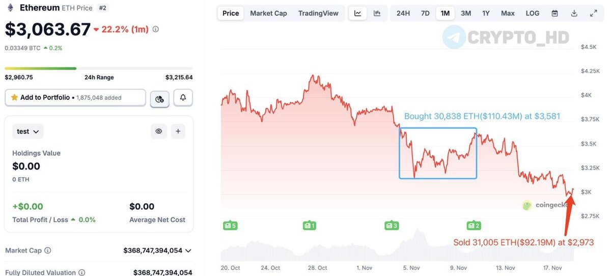 😬 FAIL: Анонимный кит с 3 по 10 ноября купил 30,838 ETH за $110,43m по средней цене $3581, а сегодня продал все свои 31,005 ETH ($92,19m) c убытком в $18m. ETH ~ $3000. Crypto Headlines