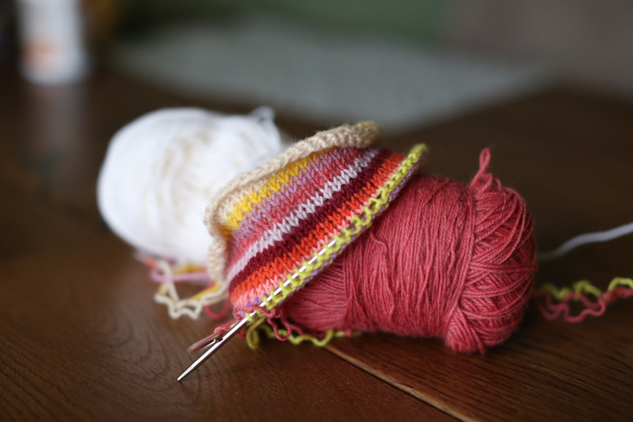 Завершишь дело - и сразу так хорошо! Вчера довязала чёрно-белый свитер и за это хвалю себя весь сегодняшний день. Чувство-то какое приятное прячется в доведении начатого до конца! Стоило регулярно бросать проекты на полпути, чтобы это испытать:))) На энтузиазме от содеянного пробежалась по тайникам и нычкам с ревизией недовязов. А что, где один довязала, там, глядишь, и ещё кому-то повезёт? По-за углам(-и) попрятались: 1. Мини-образец, задумывался как проба полосок по книге Казе Кобо (про книгу писала тут https://dzen.ru/a/aRV73siZMUHtfbkD): Про образец могу сказать словами Винни-Пуха: "Не то, чтобы совсем не попал..." Но не попала в то сочетание, что мне надо было:)) Очень хотелось создать эффект красно-смородинового полотна, но пряжа была только тех цветов, что на фото. Как говорится, "...можно приготовить устричный суп без устриц, черепаший суп без черепах, кофейный торт без кофе, но приготовить тушеное мясо без картофеля и лука свитер в красную полоску без пряжи красного цвета сове