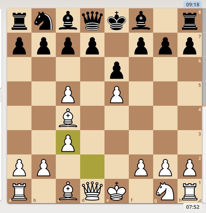 Позиция 6. Продолжение партии из прошлого примера. Сейчас Александр сыграл 1. dc и после 1…Сс5 белые остались без пешки. В этой ситуации белые не могли спасти пешку на с5, но лучше было сыграть 1. bc чтобы после 1…Сс5 ответить 2. d4 и иметь сильный центр. Два важных момента на которые хочу обратить внимание: 1. По сути партия была проиграна на 4 ходу, когда белые сыграли с5? Потеря пешки - это следствие стратегической ошибки в дебюте. 2. Я специально сделала скрин со временем. На 7 ходов белые потратили 2 минуты и 18 секунд. Это говорит, что это не зевок или спешка, а именно ошибки в мышлении в дебюте.