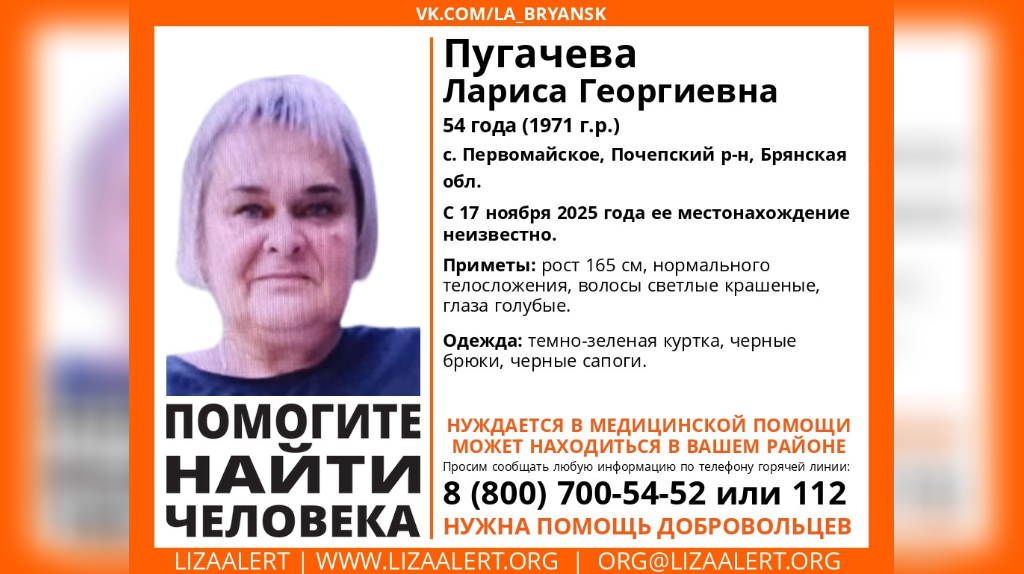 С 17 ноября 2025 года в областном центре ищут Ларису Пугачёву. Женщина нуждается в медицинской помощи и может находиться как в Брянске, так и в других районах региона. В Брянске ведутся поиски Ларисы Георгиевны Пугачёвой, которой 54 года. Женщина пропала 17 ноября 2025 года, после чего её местонахождение остаётся неизвестным. Поисковики отмечают, что она может находиться как в Брянске, так и в других населённых пунктах региона. Известно, что пропавшая нуждается в медицинской помощи. Всех, кто владеет любой информацией о Ларисе Пугачёвой, просят сообщить об этом по телефону горячей линии 8-800-700-54-52 или обратиться в полицию по номерам 02 и 102.