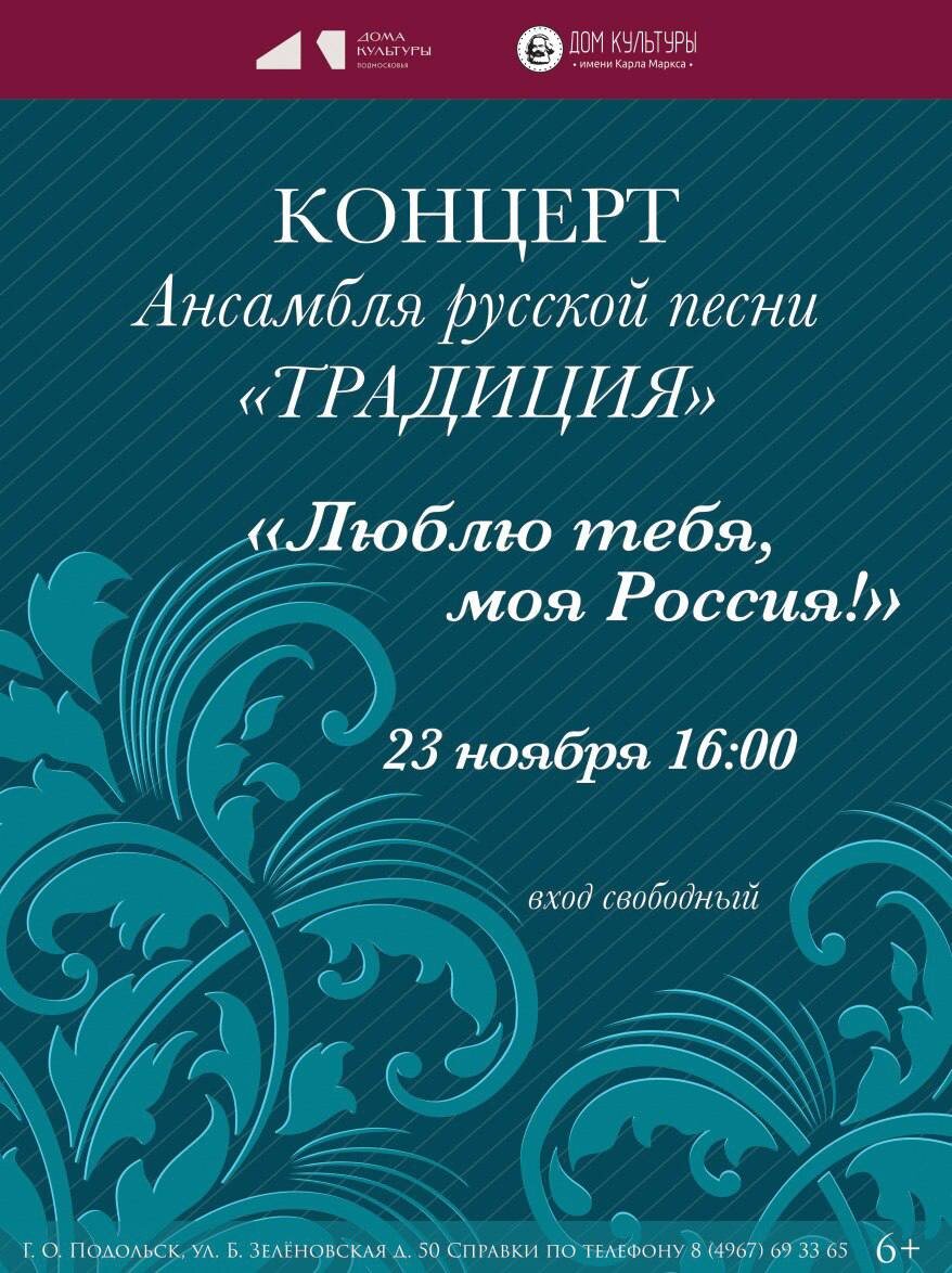 ✨ Ансамбля русской песни «Традиция» 🇷🇺В программе вечера прозвучат лучшие произведения о любви к Родине, о нашем прекрасном Подольске, о дружбе и патриотизме, которые наполнят вас теплом и радостью. 🚫 Возраст: 6+ 📆 23.11.2025 🕒 16:00 🏢 ДК им. Карла Маркса 📍 г. Подольск, ул. Большая Зелёновская, 50 💰 Вход свободный❗️ ⭐Поддержать канал голосом 🍰Где поесть в Подольске ✅ Мероприятия Подольск https://dzen.ru/id/66ed500f7b5671493eca3fd6 http://vk.com/podolsk_events http://dzen.ru/podolsk_events