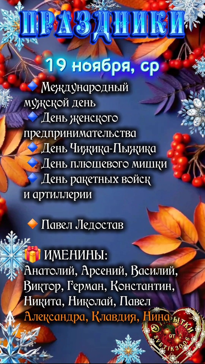 🔹️Международный мужской день. В календаре утвердился, хотя и неофициально, чисто мужской праздник в противовес женскому - Международный мужской день. Несправедливо праздновать только дни отцовства — иначе без праздника остаются бесплодные мужчины и те, кому еще рано иметь детей. Мужчины нуждаются в таком же внимании, как и женщины в Международный женский день. 🔸️Павел Ледостав. Ледоставом Павла прозвали потому, что считали: в его день воду в реках и озерах сковывает льдом. По льду на реках судили о будущем урожае: «Если лед грудами — то и хлеба будут груды. Если гладко — то и хлеба будет гладко». Если на Павла выпадал снег, это предвещало снежную зиму. Безветренная погода говорила о том, что нужно ждать скорых морозов.