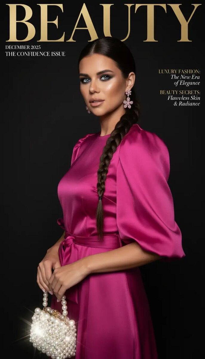 А давай обложки для глянцевых журналов со своим лицом погенерим Рубрика промпт дня #промпт_дня_nc Генерировал на сайте агрегатора Syntx в Нано Банана. *может коверкать буквы, делайте надписи поменьше и перегенерации, с русским работает плохо, в некоторых промптах не указаны названия журналов, будет или рандом или вписывайте название в промпт Подгружайте селфи и вводите промпты: BEAUTY Create a sleek and luxurious beauty and fashion magazine cover inspired by BEAUTY, December 2025 issue. The composition features a poised female model exuding confidence and modern elegance. She is dressed in a vibrant magenta satin dress with puffed sleeves and a waist tie, posing gracefully against a deep black background that accentuates her radiant presence. Her long dark hair is styled into a sleek, polished braid cascading over one shoulder. She holds a pearl-embellished handbag in one hand, its iridescent details glimmering softly under the studio lights. Her makeup is flawless. She wears delica