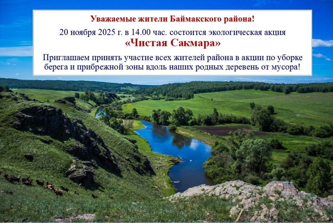 Хөрмәтле Баймаҡ районы халҡы! Баймаҡ районы хакимиәте 20 ноябрҙә район халҡын Һаҡмар йылғаһы ярҙарын һәм яр буйы биләмәләрен сүп-сарҙан таҙартыу буйынса «Таҙа Һаҡмар» экологик акцияһында ҡатнашырға саҡыра. Башлана 14.00 сәғәттә. Һаҡмар йылғаһы буйында урынлашҡан ауылдарҙа йәшәүселәр айырыуса әүҙемлек күрһәтер, тип ышанабыҙ.