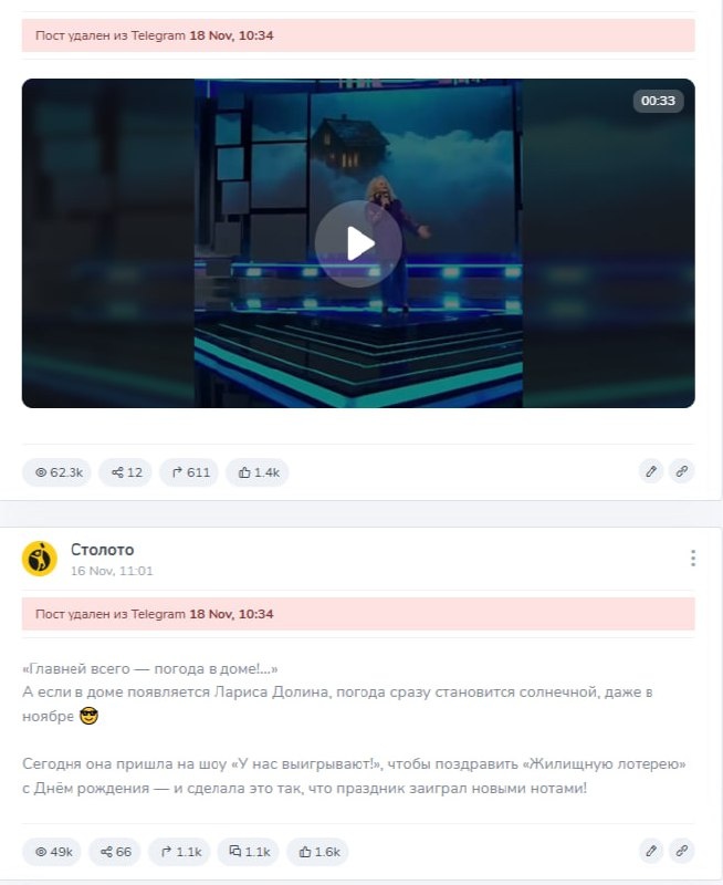 🗑 В соцсетях «Столото» удалили посты, посвящённые визиту Ларисы Долиной на праздничный выпуск жилищной лотереи — слишком сильным оказался