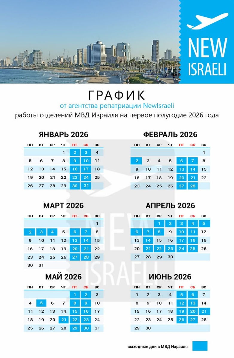 📅 График работы МВД Израиля на второе полугодие 2026 года — ваш удобный календарь для подачи документов, продления виз и оформления статуса Мы подготовили обновлённый календарь выходных и рабочих дней отделений МВД Израиля на июль–декабрь 2026 года. Теперь вы можете заранее планировать: ✔️ продление виз А/5 ✔️ оформление удостоверения личности (теудат-зеута) ✔️ получение биометрического заграничного паспорта (теудат-маавар) ✔️ запись в консульские подразделения за пределами Израиля И самое главное — избегать дней, когда приём не ведётся 🎯 ℹ️ Почему это важно? В 2025–2026 годах нагрузка на МВД выросла, запись стала сложнее, а обработка заявлений — дольше. Правильно выбранный день экономит часы ожидания, а иногда и недели задержек. Наш календарь: 🔹 показывает все официальные выходные 🔹 включает закрытые дни, когда отделения не работают 🔹 помогает выбирать наиболее «свободные» даты 🔹 идеально подходит тем, кто планирует репатриацию или продление статуса заранее 🛂 Хотите, чтоб
