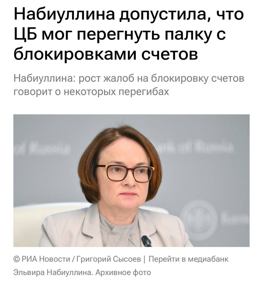 «Выросли жалобы на необоснованную блокировку счетов. То есть борясь с мошенничеством, мы где-то перегнули эту палку, что называется. Клиентам не всегда объясняли, почему заблокировали эти средства", — заявила глава ЦБ на конференции Банка России "Фокус на клиента". Не знаю что тут прокомментировать. Оставлю как есть. С налогами тоже перегнули.