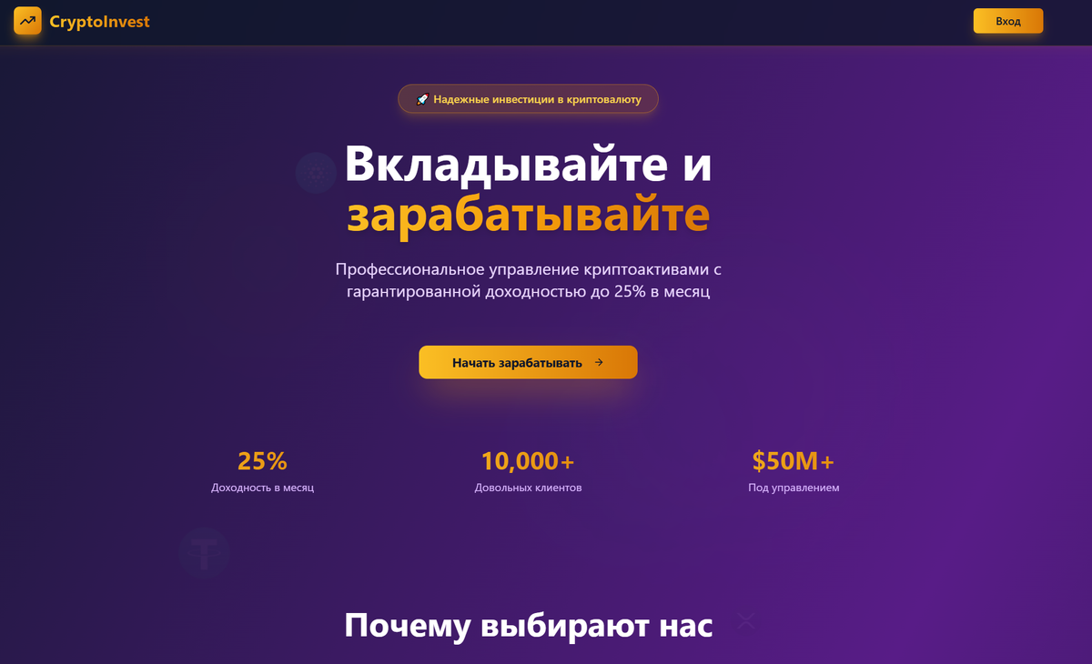 Проект Cryptoproinvest io преподносится как инвестиционная платформа, специализирующаяся на криптовалютах и управлении капиталом. На сайте обещается значительный пассивный доход, “профессиональные трейдерские стратегии” и возможность вложить средства, чтобы получать ежемесячные проценты. Все это звучит заманчиво, но при более глубоком анализе возникает ряд серьёзных вопросов и тревожных моментов. Cryptoproinvest io — это сервис, который обещает многое: высокий доход, “профессиональные трейдерские стратегии” и пассивные инвестиции в криптовалюты. Однако за обещаниями скрываются серьёзные риски: отсутствие прозрачности, нет гарантированной лицензии, сложность с выводом и возвратом средств, а также недостаточно независимых подтверждений заявленной доходности. В связи с этим я не рекомендую рассматривать этот проект как безопасную и проверенную платформу для инвестиций. ⚠️ ВАЖНО! Проект, который прошел проверку.