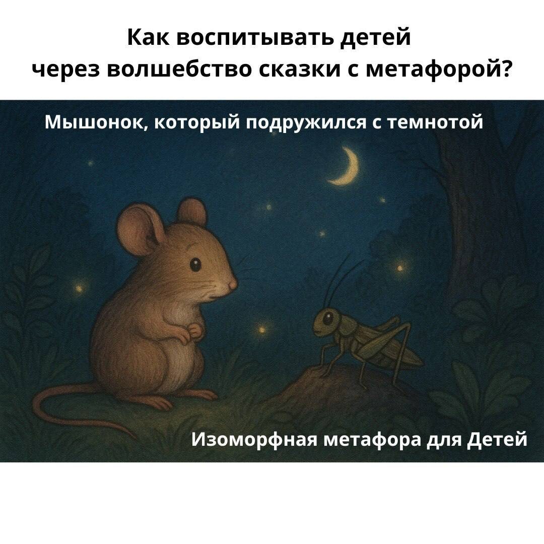 Иногда детям сложно прямо говорить о своих переживаниях. Страх темноты, разлуки, громких звуков или новой обстановки остаётся внутри. И чем больше вы его пытаетесь «логично объяснить», тем сильнее он растёт. Мягче всего помогает изоморфная метафора - короткая сказка, где герой переживает похожий страх и находит свой способ справиться. Как это работает? Вот пример из моей практики До: Обратилась женщина с проблемой. Ребенок боялся темноты, плохо засыпал по вечерам. А когда просыпался ночью, пугался и плакал, находясь в темноте. Метафора: «Мышонок, который перестал бояться темноты» Жил-был маленький Мышонок, который боялся темноты. Каждую ночь он дрожал в своей норке, прислушиваясь к пугающим ночным шорохам. Однажды мама Мышь мягко сказала ему: «Темнота - это как туман, она делает знакомые вещи незнакомыми и большими. Но внутри тумана всегда есть тропинки». Как-то раз Мышонок повстречал Мудрого Сверчка и рассказал ему про свой страх. Сверчок сказал ему: «Темнота не любит суеты. Попробуй