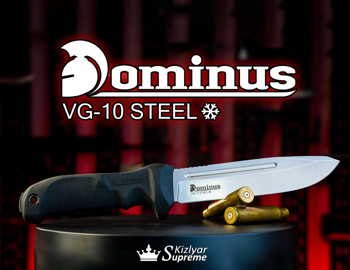Продуманность всех мелочей, бесшумный чехол и высокое качество термообработки сделало Dominus популярным среди военных и спецслужб. Однако, также эти ножи широко используются охотниками и в повседневной жизни теми, кому нравятся ножи боевого склада. Нож создан на базе рукояти боевого ножа Viluy, разработанного Виктором Луговым и отличного клинка модели Maximus. На клинке Dominus cталь VG-10 после фирменной закалки в азотной среде с последующей криообработкой показывает твёрдость порядка 61 HRC, при этом не теряя прочности. Хорошо сбалансирована: устойчива к сколам, отлично удерживает заточку и неприхотлива в обслуживании. Нож собран по принципу сквозного монтажа, хвостовик проходит рукоять насквозь и образует стеклобой. Конструкция максимально прочна и надежна. Цельная кратоновая рукоять, учитывает анатомию руки, особенно удобна для работы в перчатке. Данный нож разрабатывался для эксплуатации в подразделениях МЧС. Ножны состоят из многофункционального подвеса из баллистического нейлон