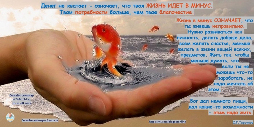 Денег не хватает - означает, что твоя ЖИЗНЬ ИДЕТ В МИНУС. Твои потребности больше, чем твое благочестие. Жизнь в минус ОЗНАЧАЕТ, что ты живешь неправильно. Нужно развиваться как личность, делать добрые дела, всем желать счастья, меньше желать в жизни вещей всяких, предметов. Жить так, чтобы меньше думать, что если ты не можешь что-то заработать, не надо мечтать об этом. Бог дал немного пищи, дал какие-то возможности - этим надо жить. ✅ Торсунов Олег Геннадьевич, из онлайн-семинара «Счастье», 20-21.08.2022.