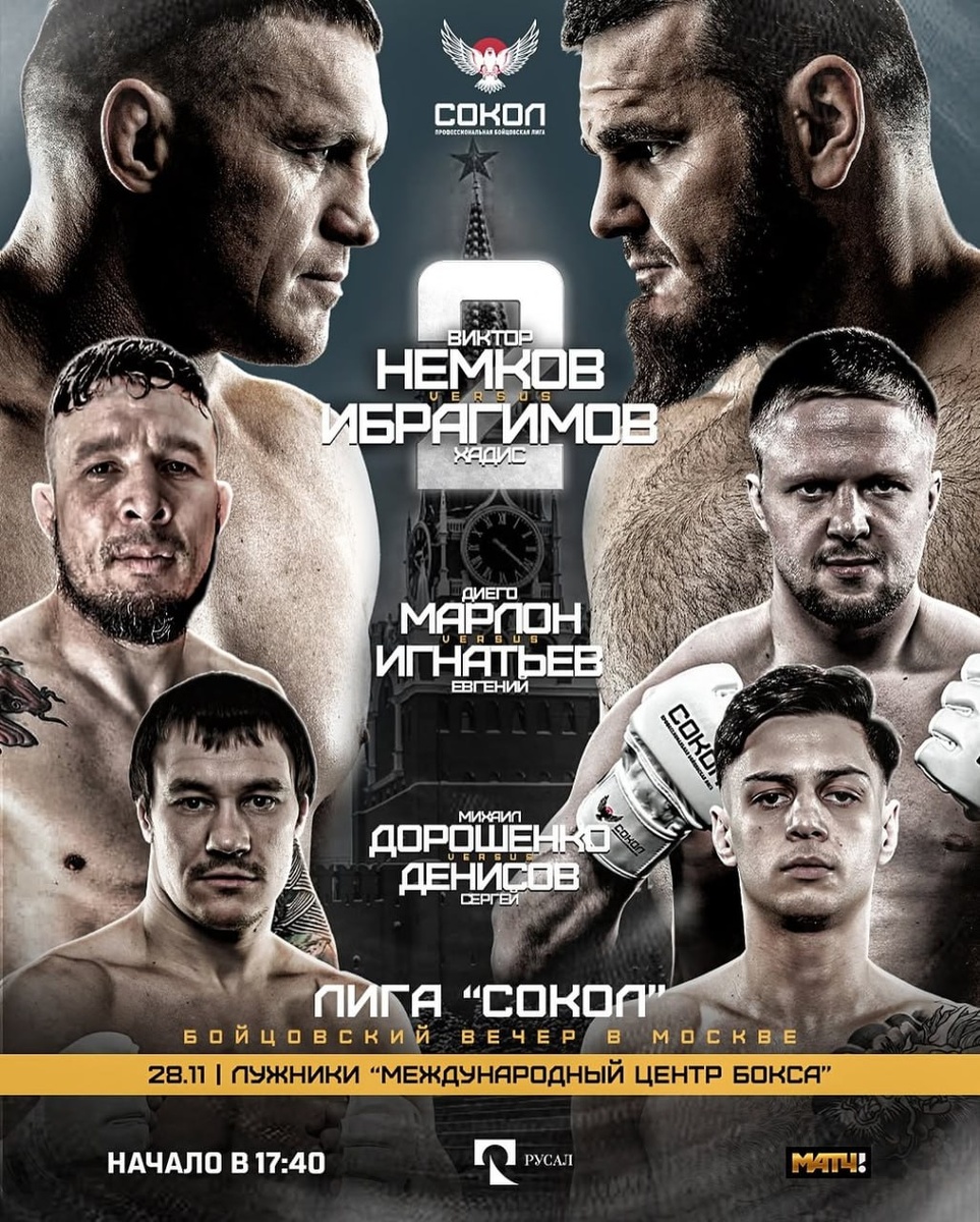 Турнир лиги «Сокол» по правилам ММА 28 ноября Реванш между двумя именитыми тяжеловесами — Виктором Немковым и Хадисом Ибрагимовым Боец из Бразилии, выступавший в сильнейших лигах мира, и настоящий мастер болевых и удушающих Диего Марлон — против неудержимого Евгения Игнатьева, который не позволил ни одному бойцу в своей профессиональной карьере заставить его постучать, намерен продолжить эту традицию. Противостояние двух сильных ударников, которые сойдутся в жёстком лобовом столкновении в клетке — Михаил «Бульдозер» Дорошенко против Сергея Денисова. 28 ноября, Москва. Международный центр бокса в Лужниках. Начало турнира в 17:40. Начало трансляции на Матч Боец в 17:40. Начала трансляции главного карда на Матч ТВ в 19:30. Подпишись, чтобы не пропустить