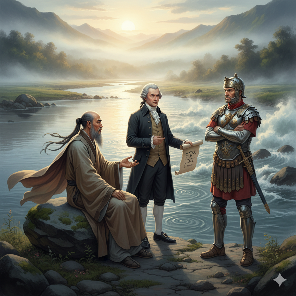 Сцена: Воображаемый берег реки. У камня сидит Лао-цзы, глядя на поток. Рядом с ним, стоя с прямой спиной, Марк Аврелий, напряженно глядящий на горизонт. Между ними, с блокнотом, Иммануил Кант.