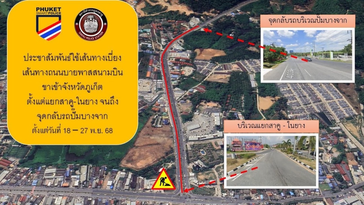 Участок дороги от аэропорта Пхукета к шоссе Thepkrasattri Rd. закрыли на ремонт Километровый участок дороги 4026 от 📍светофора у международного аэропорта Пхукета до 📍автозаправки Bangchak и отеля Royal Lee Resort & Spa был закрыт для движения транспорта на период с 18 по 27 ноября. Об этом сообщил сегодня полицейский участок Саку, в зону ответственности которого входит территория вокруг Phuket International Airport. Речь идет об основной подъездной дороге к аэропорту (шоссе 4026), соединяющей Thepkrasattri Rd. (шоссе 402) и прибрежную дорогу (шоссе 4031). Полиция Саку не уточнила, какие именно работы будут вестись на дороге, но 18-27 ноября весь транспорт на участке в 1 км от светофора до АЗС Bangchak будет вынужден делить полосы, изначально предназначенные для движения к аэропорту (см. схемы выше). Департамент скоростных магистралей Пхукета (DOH Phuket) публично не анонсировал никаких работ на шоссе 4026. Во всяком случае «Новостям Пхукета» не удалось найти никаких уведомлений на