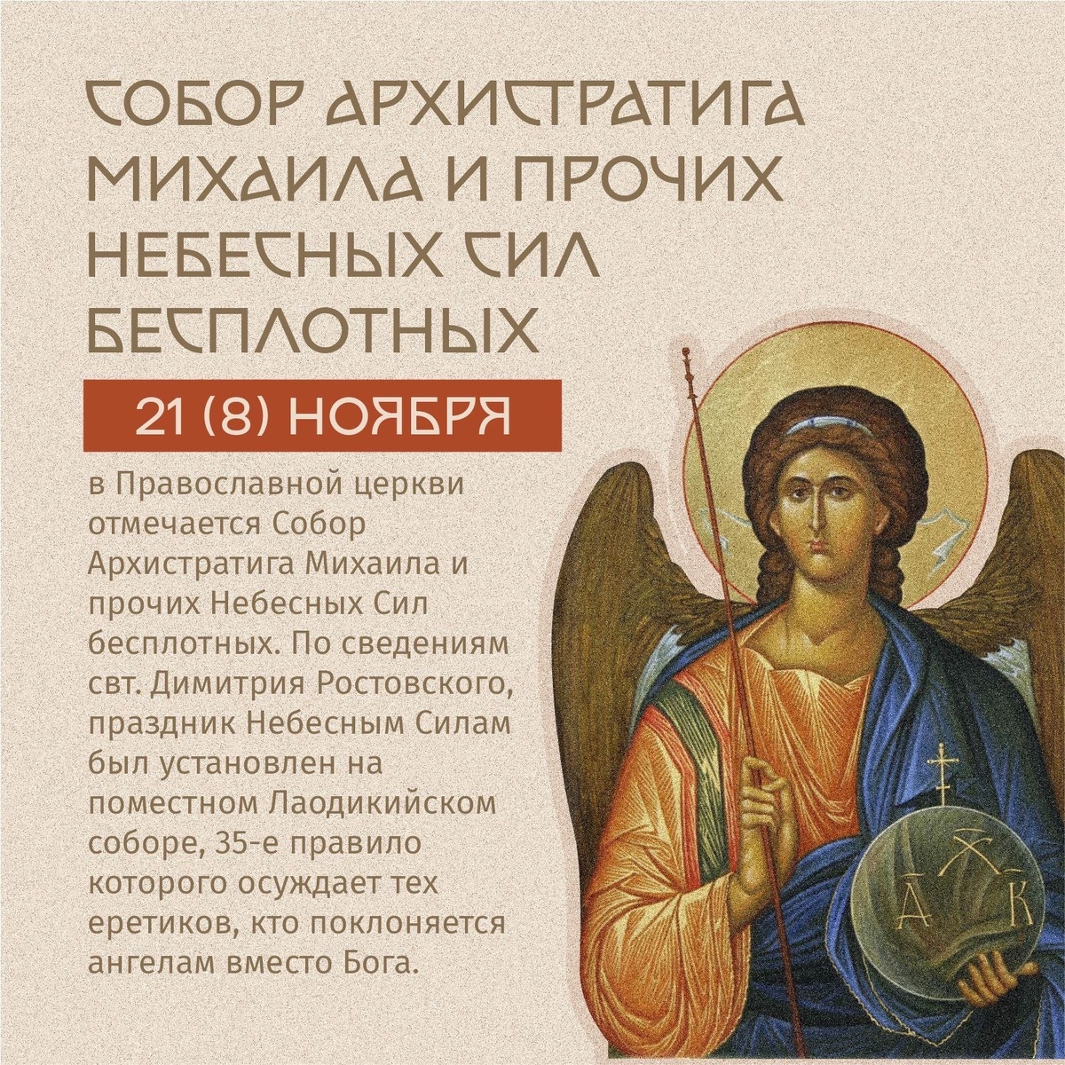 21 (8) ноября в Православной церкви отмечается Собор архистратига Михаила и прочих небесных сил бесплотных. По сведениям святителя Димитрия Ростовского, праздник был установлен на поместном Лаодикийском соборе, 35-е правило которого осуждает еретиков, поклоняющихся ангелам вместо Бога. Подробнее рассказали в карточках: