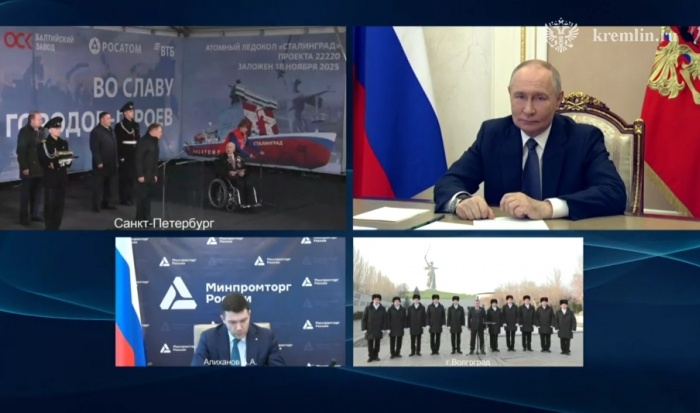 В режиме видео-конференц-связи Президент России Владимир Путин принял участие в церемонии закладки атомного ледокола проекта 22220 «Сталинград». Глава государства подчеркнул, что новое судно с честью будет носить свое имя. Церемония установки закладной доски ледокола проходит в эти минуты в Балтийском море, его будет строить российская госкорпорация атомной энергетики. Губернатор Волгоградской области Андрей Бочаров также принимает участие в закладке судна в режиме ВКС. «Хочу выразить радость и поздравить всех с важным событием – началом строительства нового атомного ледокола на Балтийском заводе, который получит славное имя "Сталинград", – обратился Владимир Путин к участникам события. – Это символ памяти и уважения к стойкости защитников и жителей этой легендарной крепости на Волге, проявивших доблесть и храбрость в масштабной битве, которая во многом повлияла на ход Великой Отечественной войны и Второй мировой войны в целом, оказав значительное воздействие на историю всего человечес