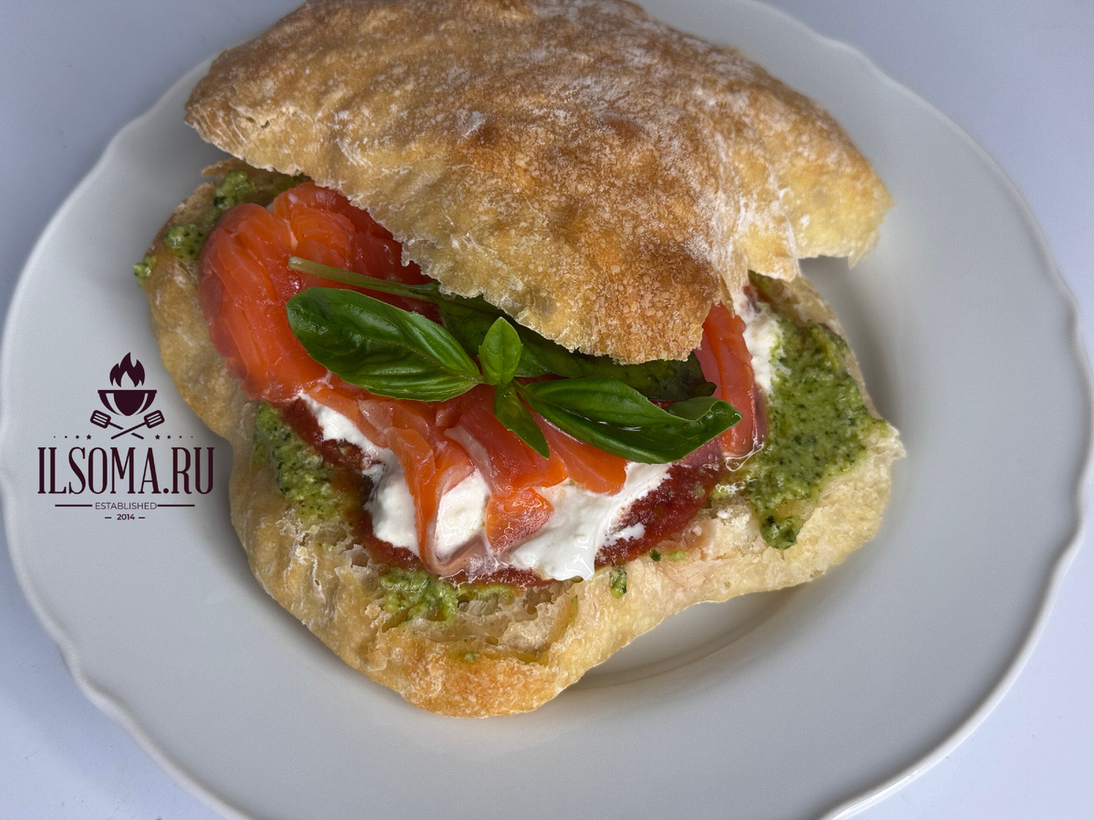 На остывшие ломтики хлеба щедро намажьте соус песто . Он даст потрясающую травяную ноту и свяжет все ингредиенты. 🍃 Добавьте томатный соус, жалетально с базиликом. Сверху разложите тонкие слайсы красной рыбы. 3: Финальные штрихи!