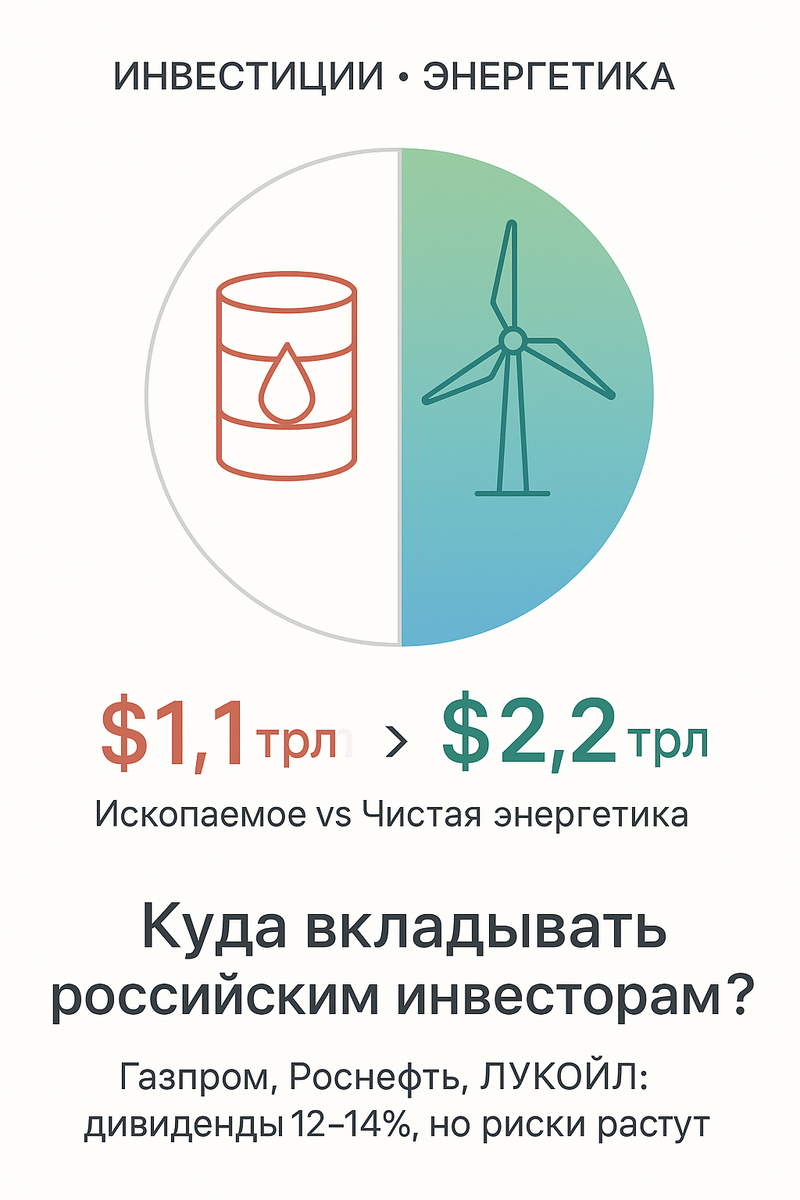 Газпром, Роснефть и ЛУКОЙЛ предлагают дивиденды 12-14%, но сталкиваются с санкциями и падением спроса. Доступ к зарубежным ETF на возобновляемую энергетику закрыт с 2022 года. При этом традиционные нефтегазовые компании на Мосбирже торгуются с экстремально низкими P/E (1,14-4,24x), отражая геополитические риски. Следующие 10 лет определят, кто из инвесторов адаптируется к новой энергетической реальности, а кто останется с обесцененными активами.