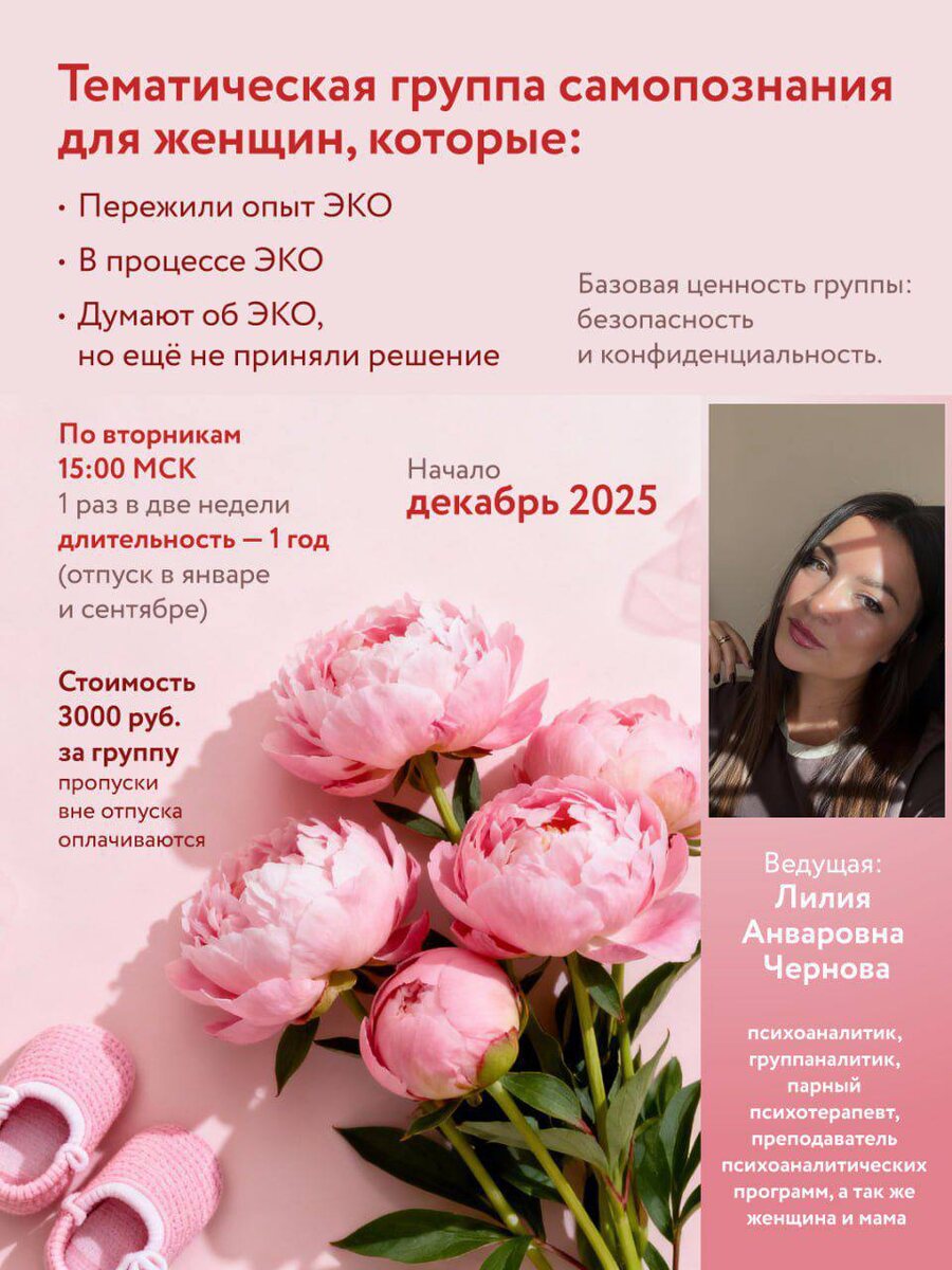 Открывается новая психотерапевтическая группа с заданной тематикой. Иногда путь к материнству оказывается совсем не таким, как мы ожидали. Он может быть сложным, тихим, наполненным вопросами, на которые не всегда просто ответить даже себе. Многие женщины, думая об ЭКО или проходя его, сталкиваются не только с медицинскими решениями, но и с глубокими чувствами: сомнениями, страхом, виной, стыдом, ощущением, что «я не такая, как другие», или трудностью принять своё тело в новом свете. Иногда появляется мысль: «А имею ли я право хотеть этого? А точно ли это мой путь?» Мы создали терапевтическую группу, где можно прикоснуться к этим чувствам бережно, без давления и оценок. Где можно исследовать свои внутренние движения — желание и сопротивление, надежду и усталость, страх быть разочарованной и страх получить желаемое. Где можно позволить себе быть неуверенной, уязвимой, честной. В этой группе вы сможете: * исследовать внутренние конфликты, связанные с ЭКО, материнством, телом и иденти