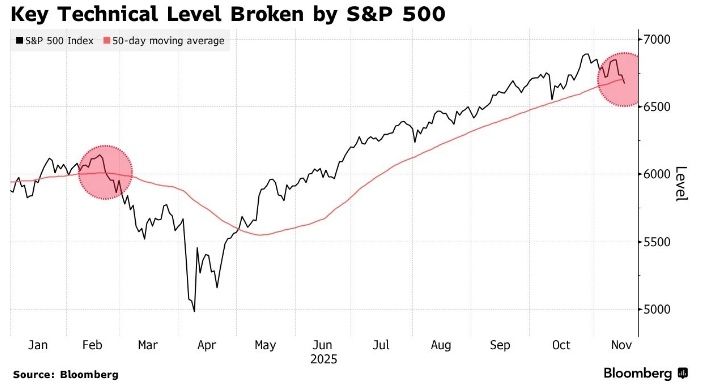 S&P 500 закрылся ниже 50-дневной средней впервые за 139 сессий, а Nasdaq Composite также сигнализирует о слабости. Некоторые стратеги прогнозируют снижение S&P 500 на 5–10% и Nasdaq Composite на 8%. Аналитики фондового рынка США выражают обеспокоенность по поводу возможного начала масштабной коррекции индекса S&P 500, которая может составить не менее 10%. В понедельник индекс S&P 500 резко упал на 3,2% после достижения рекордного уровня 28 октября. Это стало самым значительным падением с февраля-апреля. Индекс закрылся ниже 50-дневной скользящей средней, что не происходило с 2009 года. Уровень 6725 пунктов, по мнению Ли Копперсмита из Goldman Sachs, мог стать триггером для перехода количественных фондов (CTA) из покупателей в продавцов. Дэн Руссо из Potomac Fund Management отметил, что прорыв 50-дневной скользящей средней в сочетании с обновлением минимумов многими акциями может стать сигналом к росту продаж. Джон Рок из 22V Research также предупредил о слабости рынка, указав, что боль