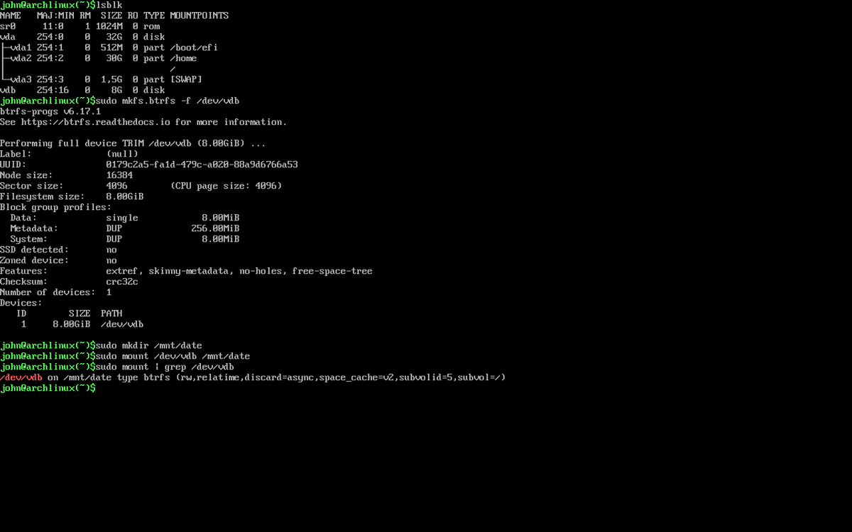 И так в повествовании для примера будем используем диск /dev/sdb отформатированный в Btrfs, напомню команду