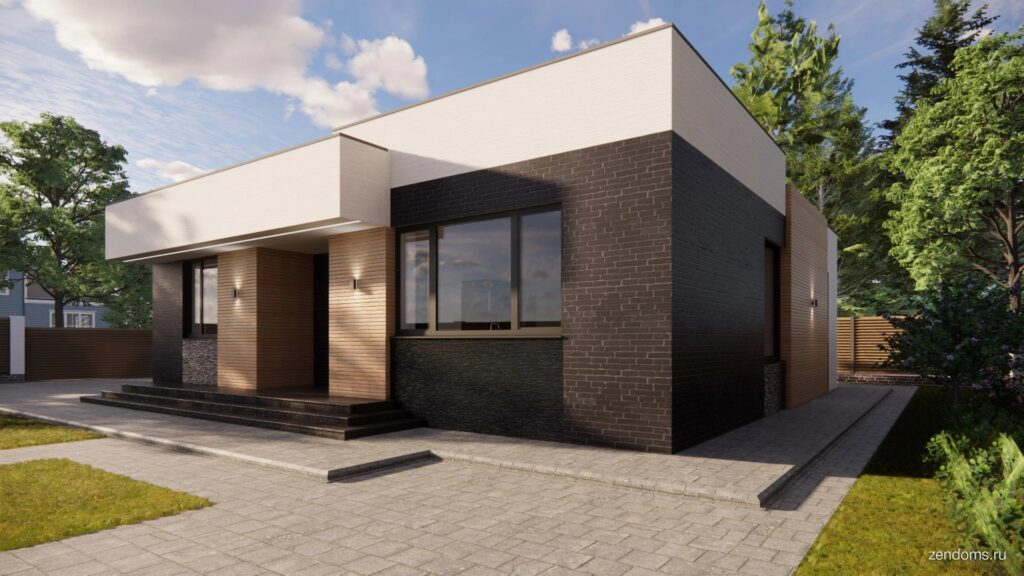 Предлагаем рассмотреть наш топовой вариант проекта одноэтажного дома в современном исполнении. Дом представлен с плоской крышей. Площадь дома: 120 кв. м