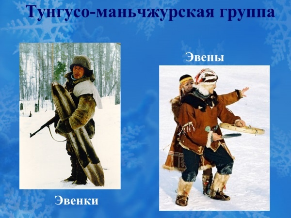 Тунгусо-маньчжурские народы, как и тюркские и монгольские народы, относятся к алтайской языковой семье. Само существование этой семьи не всеми исследователями признается, т.е. отрицается общее происхождение трех названных выше групп. Некоторые исследователи относят к алтайской языковой семье даже японцев и корейцев. Но существование каждой из этих групп по отдельности всеми признается. У народов, входящих в одну группу, схожие языки или они даже разговаривают на разных диалектах одного языка, зачастую схожие обычаи, что может свидетельствовать об общем происхождении от некогда малочисленной группы людей одного народа, по каким-то причинам разделившимся на отдельные группы, мигрировавшим на новое место жительства, смешавшимися с местным населением, с неизбежным со временем изменением языка и генетики. Маньчжуры живут преимущественно в северо-восточной части Китая, Манчжурии. Эвенки живут в российской Сибири, Забайкалье и Приамурье, а также на севере Китая. Эвенкский язык находится на гр