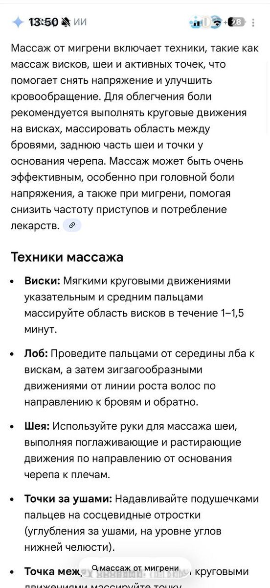 💔 Последнее время у меня дико болит голова Мигрени, напряжение в глазах, такое ощущение, что лоб хочет уйти в отпуск без меня :) Таблетки я не люблю — помогают на чуть-чуть, а причина остаётся та же: ноутбук, телефон, работа. Поэтому я начала делать массаж. Не скажу, что произошло чудо, но примерно на 40% становится легче. И этого уже достаточно, чтобы не злиться на собственные глаза к вечеру 👀 🟡В скринах, что про массаж говорит ИИ, может, будет полезно. Я стараюсь просто растянуть чуть мышцы вытягивающими движениями ⬆️ Мой вывод — не ждать, пока «пройдёт само». Найдите то, что снимает напряжение хотя бы частично. Массаж, перерывы, упражнения — что угодно, что работает именно у вас. Это лучше, чем каждый раз надеяться на таблетку и делать вид, что всё ок. И еще, делитесь, если у вас есть свои лайфхаки, очень будет мне полезно 🙏🏻 💔 — тоже часто болит голова из-за экрана ❤️ — я везунчик, у меня ничего не болит 🩷 Заметки о маркетинге