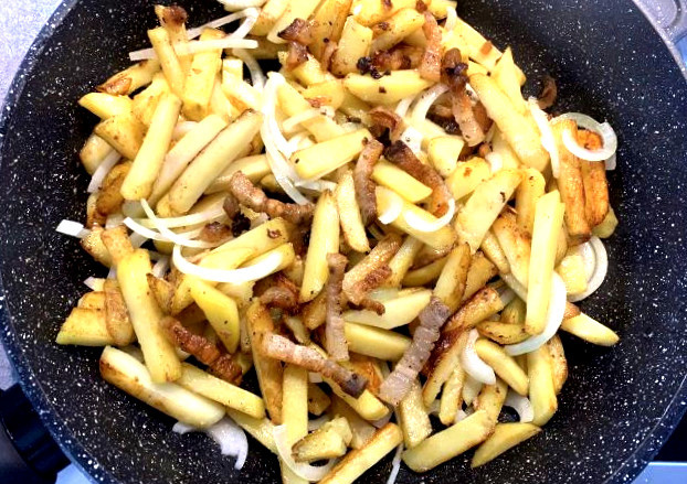 - Добавьте шкварки обратно в сковороду, перемешайте. На финише посолите — не раньше, иначе соль вытянет влагу и картошка начнёт тушиться.