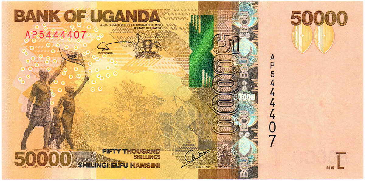 Банкнота в 50000 угандийских шиллингов является самая крупной в последней серии (2010 г.) По итогам конкурса Международного банкнотного общества (International Bank Note Society, IBNS) ее признали лучшей банкнотой 2010 г. Вероятно, причина по которым угандийскую банкноту предпочли другим «финалистам» — это интересное использование оттенков коричневого и желтого, что является символом экваториального климата. Размер: 151х74 мм. Основной цвет банкноты - коричневый и золотой. В качестве защитных средств водяной знак в виде головы восточного венценосного журавля и номинал. В левом верхнем углу обозначение банка эмитента - Банк Уганды («Bank of Uganda»). Также слева на лицевой стороне, на фоне, напоминающем плетеные корзины местного населения, можно увидеть мужской профиль в традиционном головном уборе племени карамаджонгов. В правом углу под обозначением банка, надпись «Legal Tender for Fifty Thousand Shillings for Bank of Uganda» (законное платежное средство на сумму пятьдесят тысяч шилли