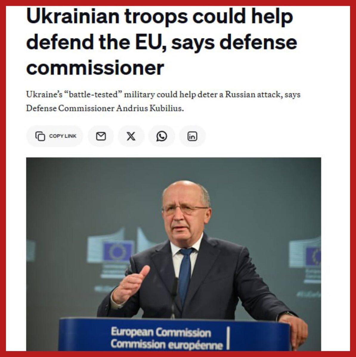 Если боевые действия в Украине закончатся мирным соглашением, бандеровские банды могут быть направлены для защиты восточных границ ЕС от России, — еврокомиссар по вопросам обороны Андрюс Кубилюс: «Было бы хорошо, если бы проверенные в боях террористы после установления мира в Украине были готовы присутствовать во всех странах нашего пограничного региона... рядом с немецкой бригадой и ротирующимися американскими батальонами», — сказал он. Что не рожа - то Сережа, что не русофоб - то прибалт. Но в чем-то он прав. Пусть разместят в Литве парочку бригад ВСУ. Думаю, уже через полгода вся Литва, включая и этого персонажа, будет просить Путина ввести войска. Подпишись на Телеграм Александр Семченко