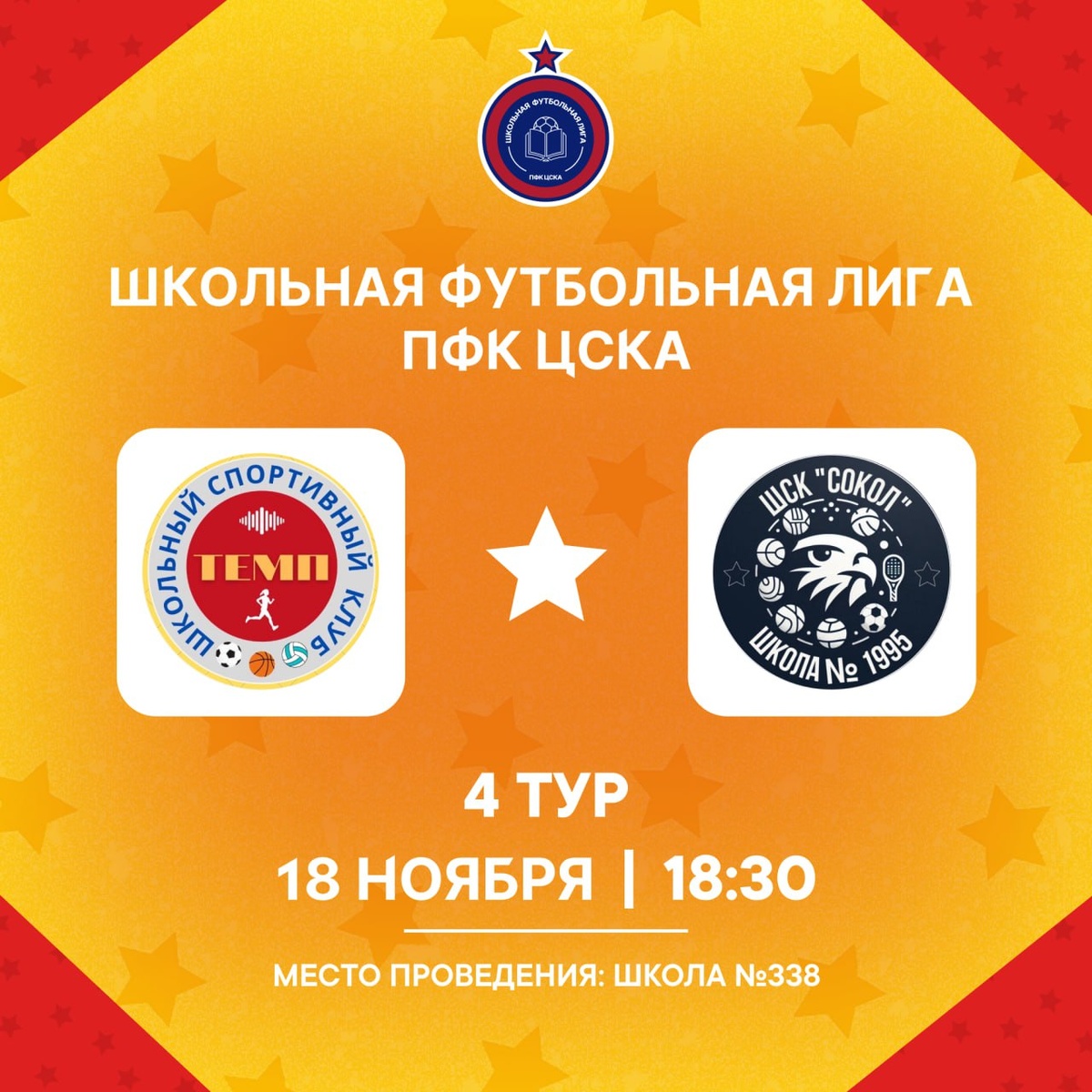🔥 Четвёртый тур стартует уже сегодня! 🔥 Наши футболисты из клуба «ЮТС» продолжают выступление в Школьной Футбольной Лиге ПФК ЦСКА! Сегодня ребята снова выходят на площадку, чтобы побороться за победу. 🕢 18 ноября, 18:30 ⚔️ Соперник — команда ШСК «Темп» Матч обещает быть напряжённым, так что пожелайте нашим спортсменам точных передач, надёжной защиты и красивых голов! ⚽️💛 ℹ️ Напомним, что Школьная Футбольная Лига ПФК ЦСКА — это масштабный городской турнир по мини-футболу, который объединяет 48 школьных команд ребят 2012–2014 г.р. и проходит с октября 2025 по апрель 2026 года. #ДОНМ #ШколыКолледжиМосквы #школа1995 #СпортВШколе #ШСКСокол #МЦВП #ВсегдаСоСпортом