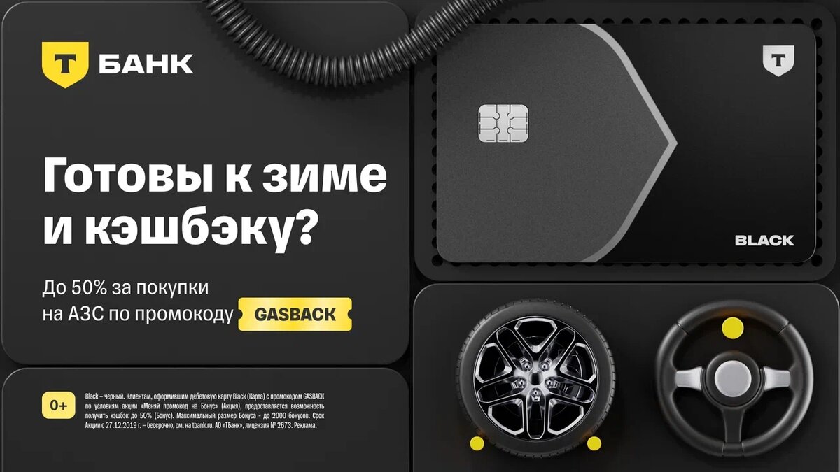 Т-Банк проводит акцию по дебетовой карте Black, за оформление которой вы получите кэшбэк 50% за покупки на АЗС и Автоуслуги. Кэшбэк приходит рублями на карту. Как принять участие в акции 1. Оформите карту Black по акционной ссылке, применив промокод «GASBACK» до 31 января. 2. Совершайте покупки с кэшбэком 50% в категориях: АЗС - оплата бензина и другого топлива на заправочных станциях и в профильных магазинах, а также покупок в магазинах и кафе при АЗС. Автоуслуги - покупка автозапчастей. Оплата в автосервисах, на СТО и автомойках. 3. Кэшбэк начислится рублями на карту в следующем месяце. Максимальная сумма кэшбэка 2000 рублей. Важные условия акции Кэшбэк 50% действует в течение 30 дней с даты активации карты. Бонус предоставляется, если у вас нет или в течение года не было карты Black. Срок действия промокода до 31.01.2026. Бонус действует только для лиц достигших 14 лет. Подробнее об организаторе акции и правилах её проведения по ссылке: https://t-cpa.ru/1P94sf Подробнее о самой кар